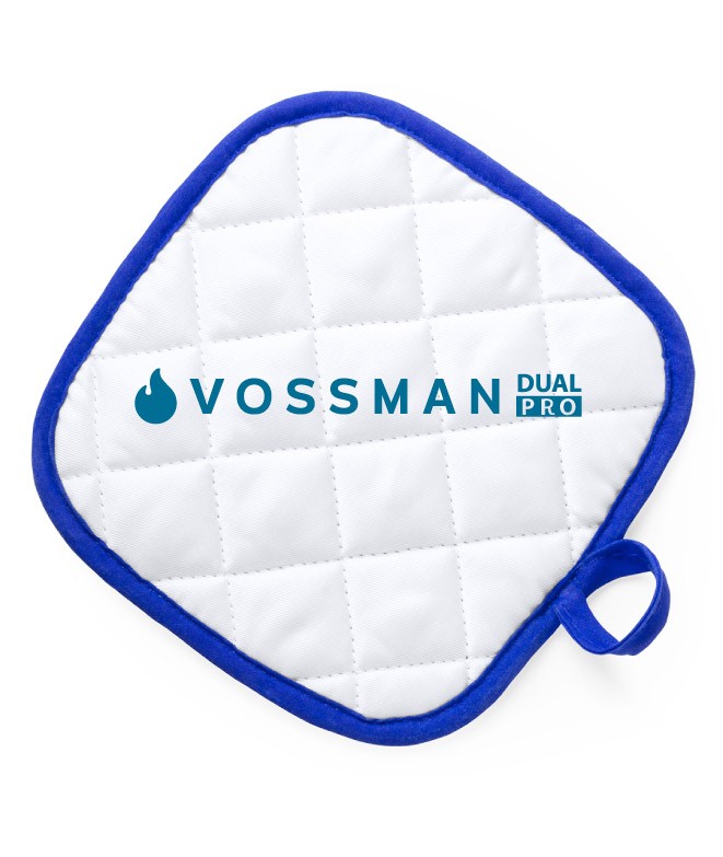 Agarrador de cocina en suave material 100% poliéster de suave acabado en color blanco y con bordes en vivos colores. Con una cara lisa especialmente diseñada para sublimación y cinta para colgar.